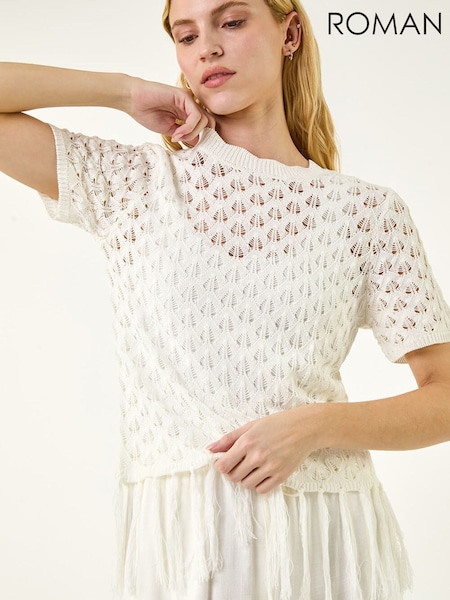 Branco - Blusa túnica romana de crochê com decote em V 3/4 manga 100% algodão